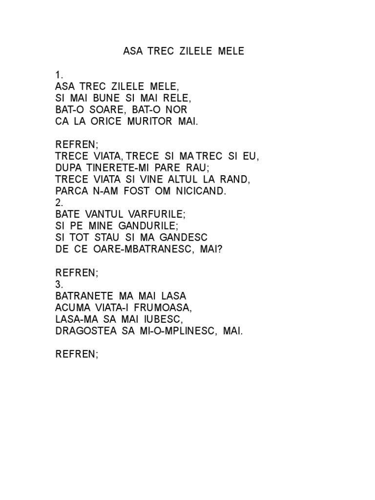 Asa trec zilele mele. Cântecul și dragostea singur prin străini cine de dragoste zace tot femeia e mai tare tare greu e iubitul. Frumusetea mea a mea a mea numai a mea numai a mea ai fost vei fi vei ramane toata viata. Lyrics asa trec zilele mele sorina ceugea si florin cercel. Maria dragomiroiu ne încântă de această dată cu o melodie populară pe tema trecerii inexorabile a timpului așa trec zilele mele acest cântec completează palmaresul solistei oltence pe lângă alte șlagăre cu care și a obișnuit asculătorii.