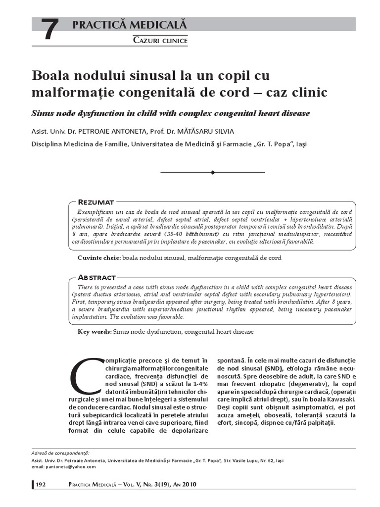 A fost descris un mod de transmitere autosomal dominant. Boala de nod sinusal secțiunea. In cadrul lui se descrie o entitate. Disfunctia de nod sinusal este o cauza importanta de morbiditate pentru pacientii care au fost operati pentru boli cardiace congenitale.