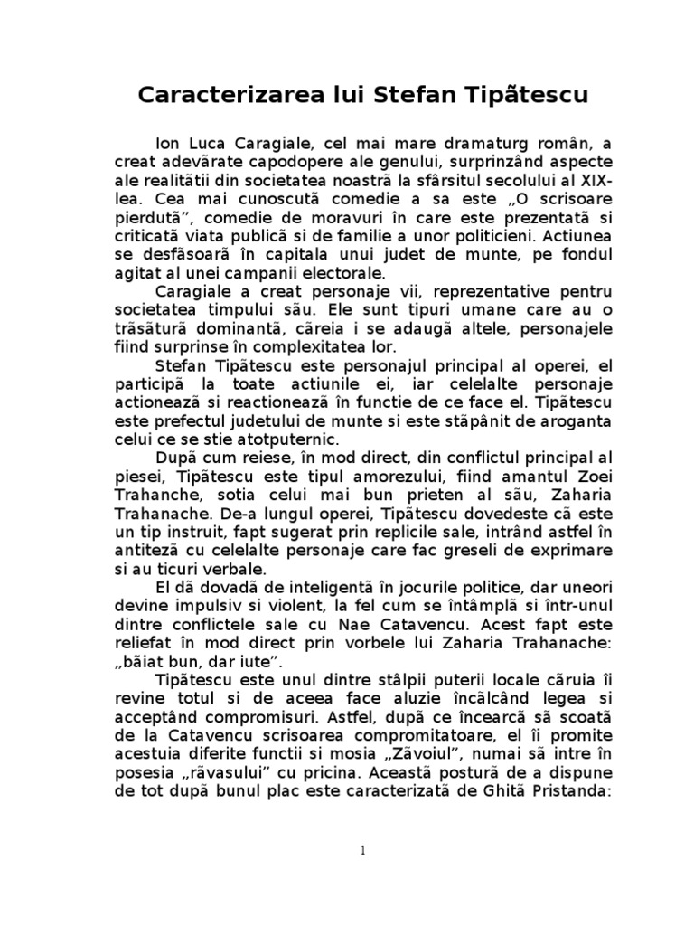 Caracterizarea Lui Stefan Tipatescu