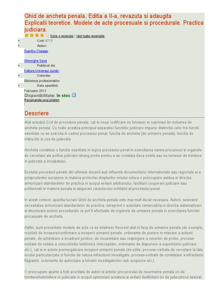 Ghid De Ancheta Penala Explicatii Teoretice Practica Judiciara Modele De Acte Procesuale Si Procedurale Dumitru Cheaga Gheorghe Sava