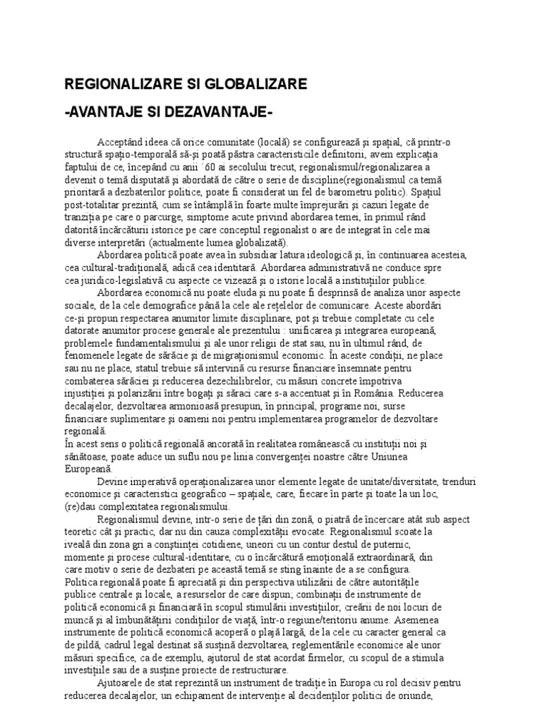 Regionalizare Si Globalizare Avantaje Si Dezavantaje