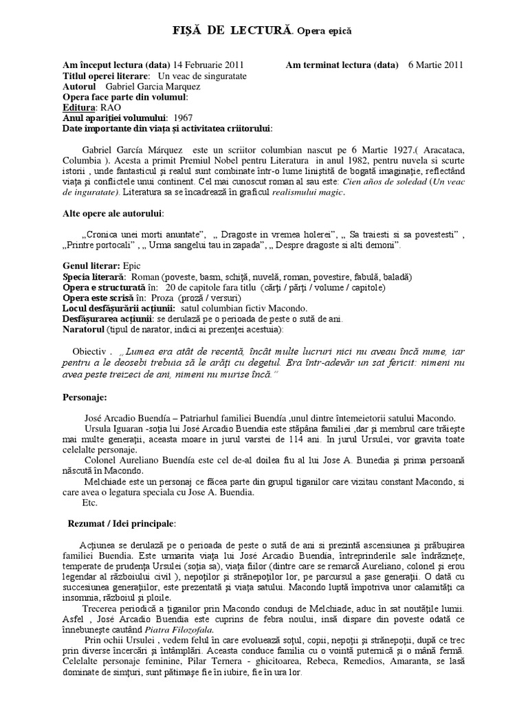Gabriel Garcia Marquez Un Veac De Singurătate Iubesc Să Citesc